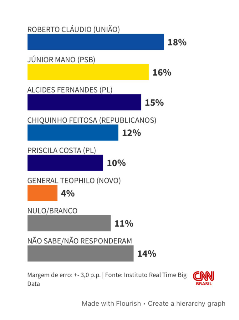No levantamento, Roberto Cláudio, que recentemente trocou o PDT pelo União Brasil, é o mais citado, mas a distância para parte dos adversários está dentro da margem de erro, de três pontos percentuais. Ou seja, empate técnico dentro do atual levantamento.